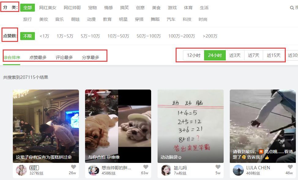 为我们提供了各大类型的短视频,比如网红美女、帅哥等,我们可以根据分类、点赞数、综合排序、时间等方式快速搜索当下最热的短视频。