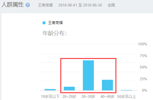 通过百度指数的人群指数分析我们发现王者荣耀的用户大部分都是集中在30-49岁之间购买能力比较强的用户。