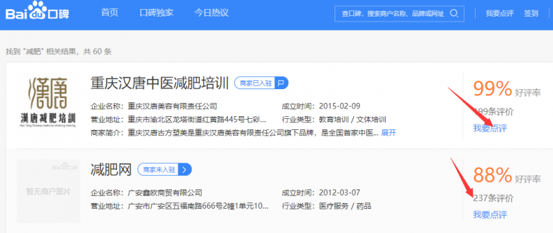 瞬间就可以找到大量相关的减肥网站,而且这些网站都已经开通百度口碑,我们可以直接进行评价引流。