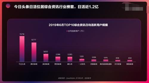 今日头条月活达2.6亿,日活1.2亿,用户人均单日使用次数达到12次,领跑行业同类APP。