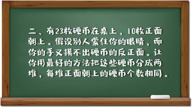 二、有23枚硬币在桌上,10枚正面朝上。假设你看不见。用最好的方法把这些硬币分成两堆,每堆正面朝上的硬币个数相同。