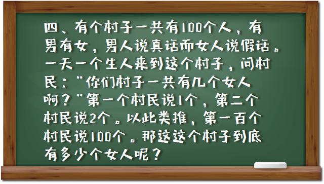 四、某村子共100个人,男说真话女说假。生人问:“村里有几个女人?”第1个人民说1个,第二人说2个。以此类推。有几女?