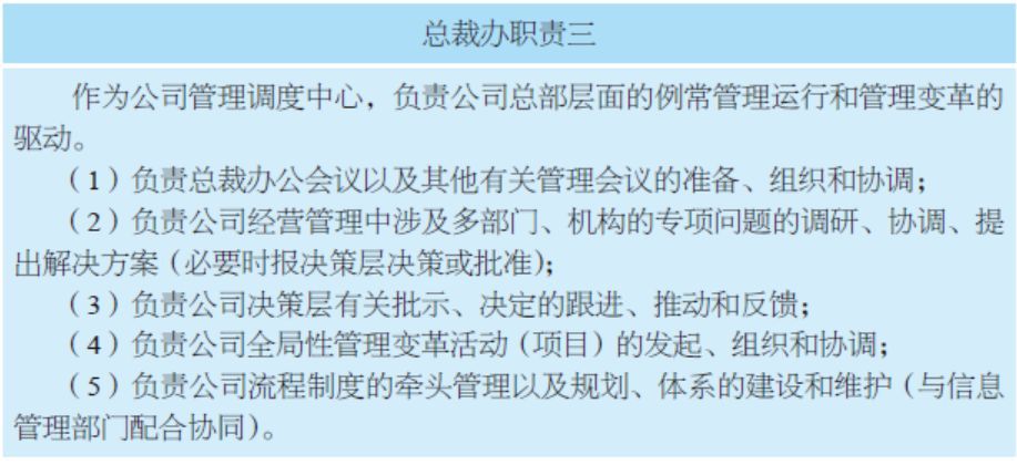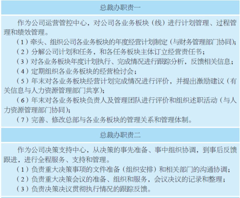 当然,不同的企业,总裁办的职责定位有所不同。比如有的企业将企业文化管理职责归入总裁办(有的企业则将其归入人力资源管理部门或独立设置部门)。职责的些许差异并不妨碍我们对这种方法的理解。