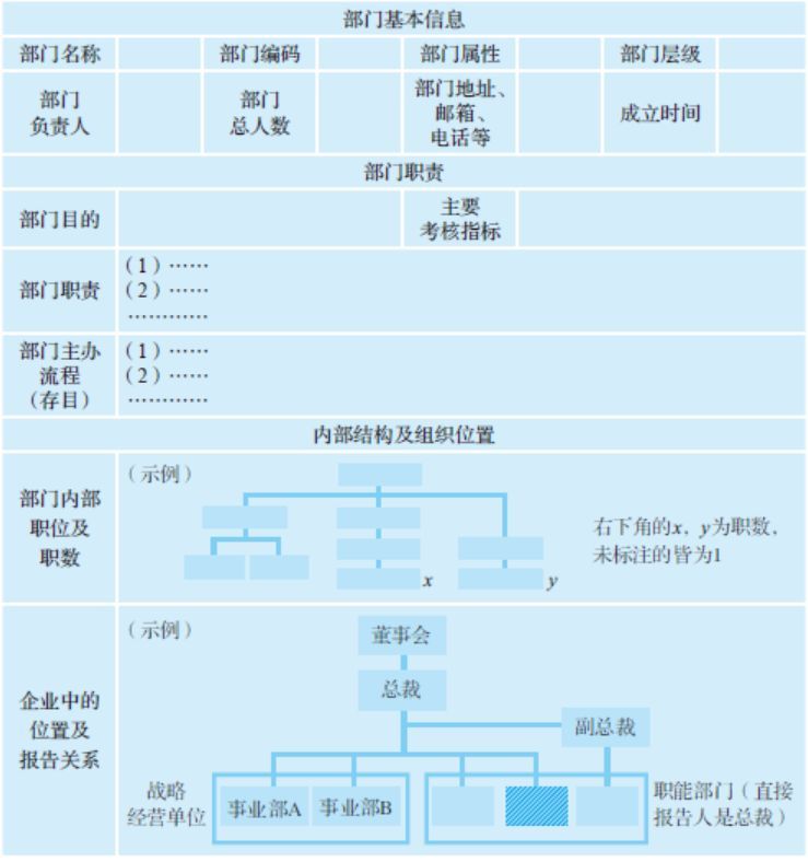 部门职责说明书是部门职责分析之后形成的组织结构设计基础文件。作为企业管理体系中的基础性规范,它是有一定意义的。但在我国企业实践中,部门职责说明书往往编写之后就束之高阁,这既有编写方面的原因(比如有效信息太少),也有管理精细化、规范化程度低的原因。下面我们提供一个部门职责说明书模板(见下图),供读者参考。