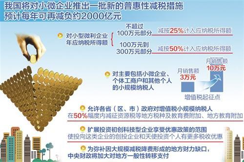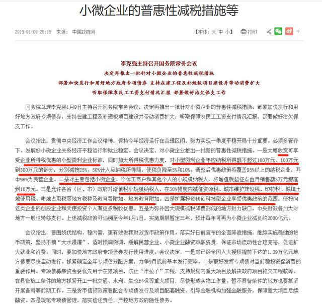 国务院总理李克强在1月9日主持召开国务院常务会议上做出的一项重要决策!会议认为发展好小微企业关系经济平稳运行和就业稳定。会议决定,对小微企业推出一批新的普惠性减税措施。减税政策可追溯至今年1月1日,实施期限暂定三年,预计每年可再为小微企业减负约2000亿元。