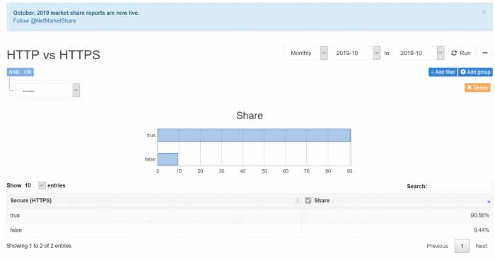 根据 外媒Netmarketshare发布的 的数据显示,截止到2019 年 10 月全球使用HTTPS密的 Web 流量的比例已经超过了九成。HTTPS网站加密传输协议几乎已经接近普及。