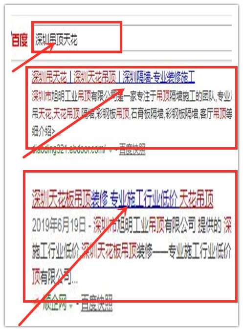 百度输入“深圳吊顶”后搜索结果是,最终它的自然排名效果非常强悍。