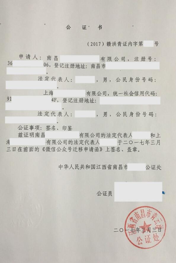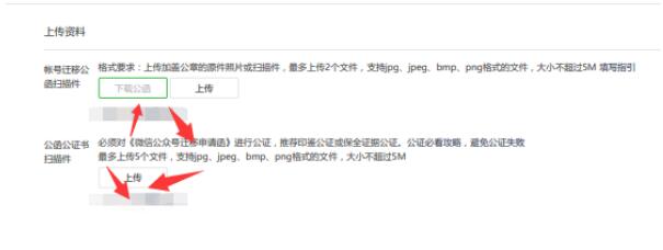 上传资料:《微信公众帐号迁移申请函》,《公函公证书》