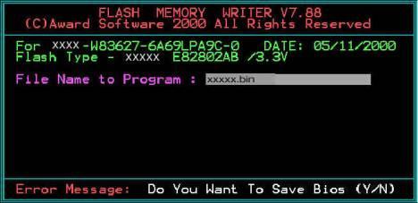 当你将文件名输入完毕后,此程序将自动显示出你所下载xxxx.BIN文件的BIOS类型及BIOS版本。并会在屏幕右下角出现一行提示:“Do You Want To Save Bios (Y/N)”此提示信息是询问你是否保存当前主机板使用的BIOS版本(如下图)