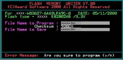 当保存完毕后,AWDFLASH程序将自动对比新旧两个BIOS版本的效验和(如下图)。并且在屏幕的右下角提示你是否要将新版本的BIOS刷进主机板的EPROM芯片中,这时你就按下Y键,等待……