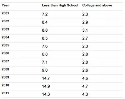图一是美国社会收入和最高学历的关系,图二是美国社会失业率和受教育程度的关系,数据来自SAUS和BLS。