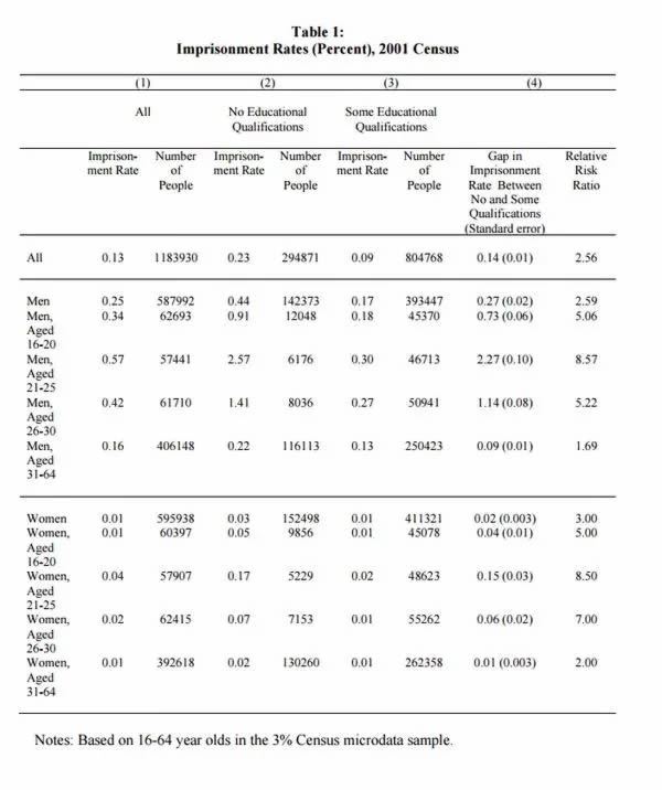 这份统计数据来自答主本校,显示的是英国的犯罪率与受教育程度关系,最后一行显示相关率,数值越大表明相关性越高,可见在21-25岁的成年男子群体中,未受教育群体比受教育群体受徒刑率高出8.57倍,犯罪乃至受徒刑可以说是道德水平低下的极致体现了,8.57倍的差距意味着什么不言而喻。用先贤的话说,教育剥离掉人野兽的一面。