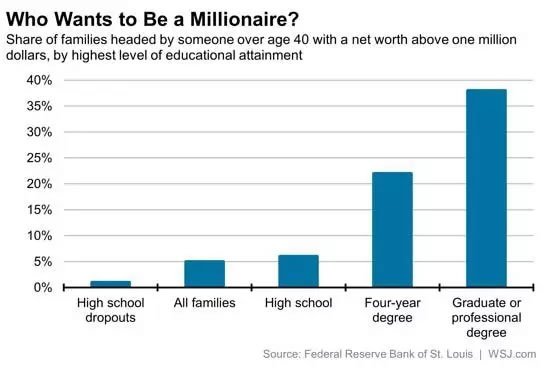 硕士学历以上家庭比高中学历家庭的百万富翁比例高30倍。