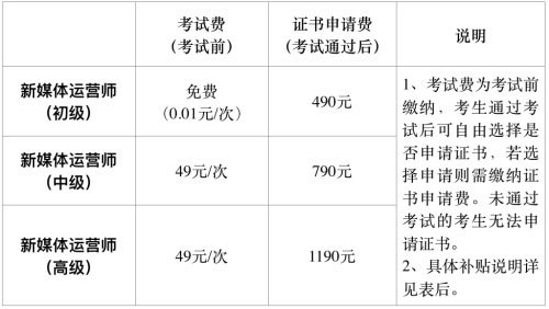 “新媒体运营师”认证共分为3个等级:初级、中级和高级,三个等级的考试费用其实并不高,其中初级新媒体运营师的考试费仅需0.01元/次,中级和高级则需要49元/次。不过通过考试之后想要申请实体证书的话,分别需要缴纳490元、790元和1190元,而大多数想要参加这项考试的人都是为了证书,所以相当于想要完成这项认证的话需要支付最低1239(1190+49)元,除此之外这项证书的培训指定了一套新媒体系列丛书在电子商务协会的官方售价。