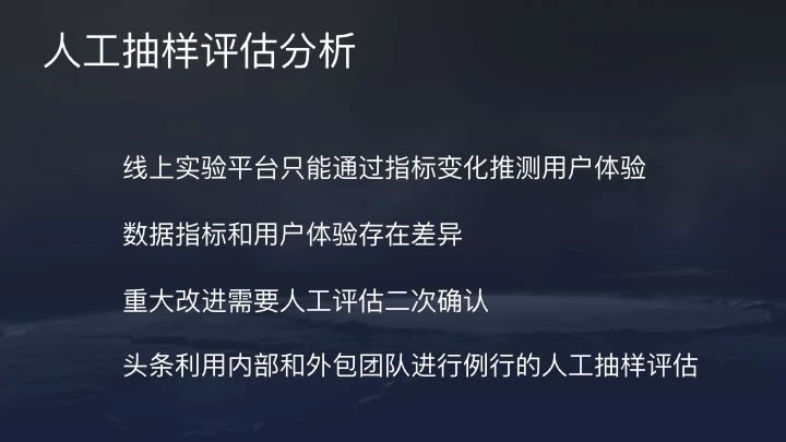 全面的评估推荐系统,需要完备的评估体系、强大的实验平台以及易用的经验分析工具。所谓完备的体系就是并非单一指标衡量,不能只看点击率或者停留时长等,需要综合评估。过去几年我们一直在尝试,能不能综合尽可能多的指标合成唯一的评估指标,但仍在探索中。目前,我们上线还是要由各业务比较资深的同学组成评审委员会深入讨论后决定。
