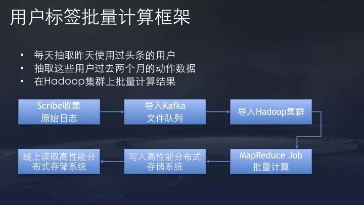 用户标签挖掘总体比较简单,主要还是刚刚提到的工程挑战。头条用户标签第一版是批量计算框架,流程比较简单,每天抽取昨天的日活用户过去两个月的动作数据,在Hadoop集群上批量计算结果。