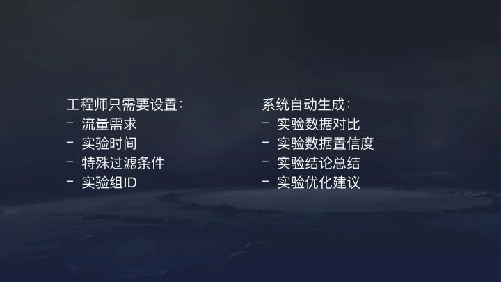 在这个系统下工程师只需要设置流量需求、实验时间、定义特殊过滤条件,自定义实验组ID。系统可以自动生成:实验数据对比、实验数据置信度、实验结论总结以及实验优化建议。