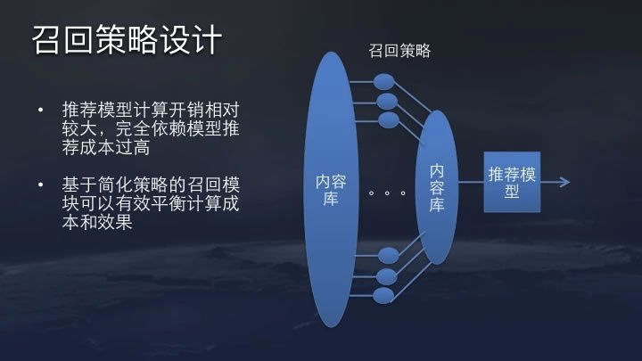 但因为头条目前的内容量非常大,加上小视频内容有千万级别,推荐系统不可能所有内容全部由模型预估。所以需要设计一些召回策略,每次推荐时从海量内容中筛选出千级别的内容库。召回策略最重要的要求是性能要极致,一般超时不能超过50毫秒。