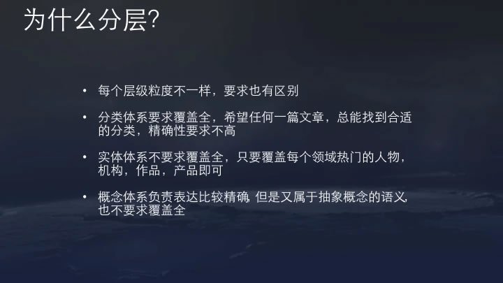 分类的目标是覆盖全面,希望每篇内容每段视频都有分类;而实体体系要求精准,相同名字或内容要能明确区分究竟指代哪一个人或物,但不用覆盖很全。概念体系则负责解决比较精确又属于抽象概念的语义。这是我们最初的分类,实践中发现分类和概念在技术上能互用,后来统一用了一套技术架构。