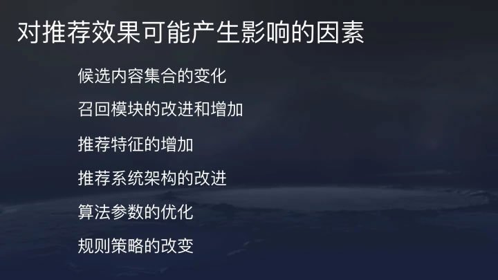 事实上,很多因素都会影响推荐效果。比如侯选集合变化,召回模块的改进或增加,推荐特征的增加,模型架构的改进在,算法参数的优化等等,不一一举例。评估的意义就在于,很多优化最终可能是负向效果,并不是优化上线后效果就会改进。