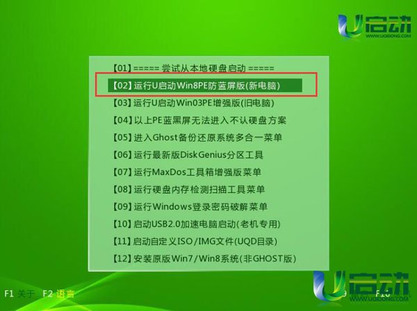 3、u启动菜单中选择【02】运行u启动win8PE防蓝屏版,按回车键执行它