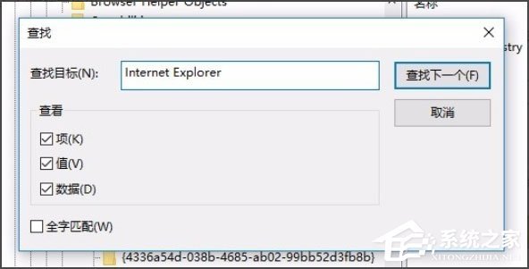 5、在查找目标窗口中输入Internet Explorer,然后点击“查找下一个”按钮;