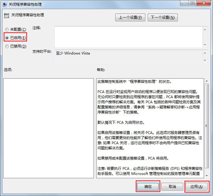 6、在弹出的“关闭程序兼容性助理”设置对话窗口中,选择“已启用”。然后在依次点击“应用”--》“确定”按钮,然后重启电脑让命令生效后,程序兼容助手已被关掉。