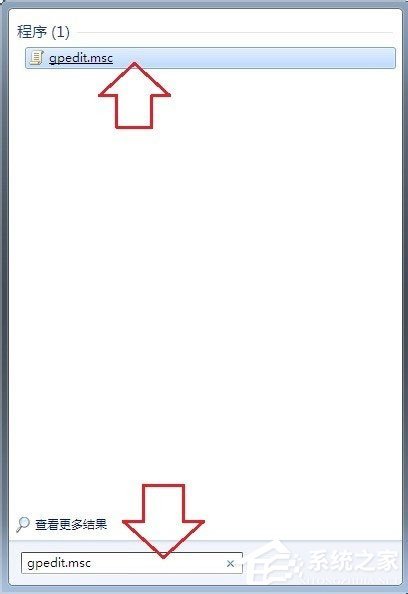 2、在最下面的“运行”对话框中,输入“gpedit.msc”命令,再点击最上面显示出来的程序;