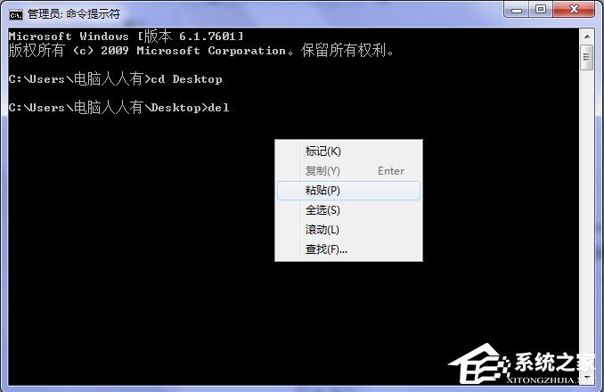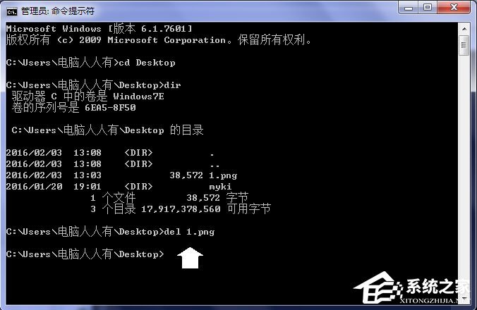 7、再使用del命令(按回车执行)删除即可(两者之间有空格),桌面上的图标就会没有了;