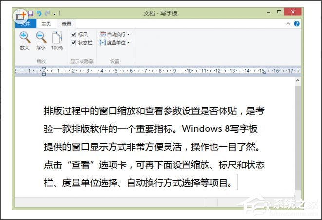 4、排版过程中的窗口缩放和查看操作是否体贴,是考验一款排版软件的一个重要指标。Windows 8写字板提供的窗口显示方式非常方便灵活,操作也一目了然。点击“查看”选项卡,可在下面通过按钮灵活选择缩放、开启关闭标尺和状态栏、选择度量单位、选择自动换行方式等项目。