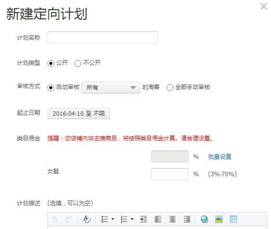 【6】计划名称随便写,方便记忆区分而已,计划类型选择“公开”,审核方式默认“自动审核”即可,起止时间默认即可,类目佣金可以看情况设置,比如你的商品价格是100元,你设置的佣金是5%,别人帮你做推广,从推广的链接卖出去一件商品,商品交易成功之后,淘宝会自动结算5元钱到推广的人的支付宝账户。