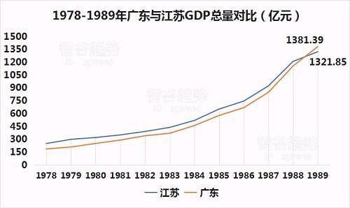 对于1984年的苏来说,当时深圳才开始经济奇迹的广东省其实还是很不起眼的一个省份,甚至连对手都算不上,直到1988年,稳坐中国经济龙头老大六年之久的江苏,终于跨过了千亿GDP的门槛,但那时紧随其后第二的却是广东,江苏做梦都想不到仅仅过了一年的1989年广东GDP首次赶超江苏后,这第一的位置,广东站上就再也没有让过位了。