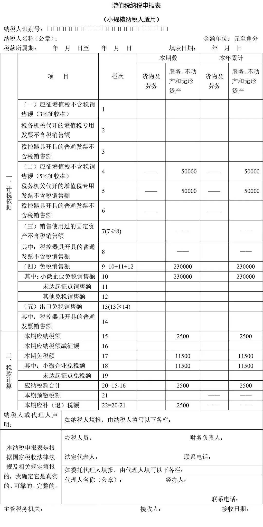 1、开具增值税专用发票部分,填列主表 “服务、不动产和无形资产”列第4栏、第5栏填写5万元,第15栏、第20栏填写0.25万(=5万×5%)。