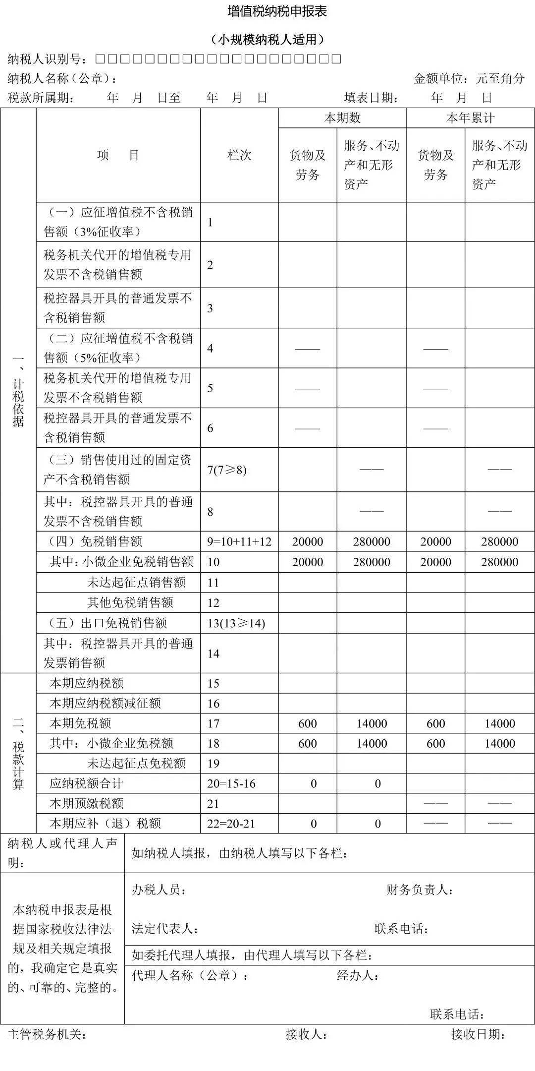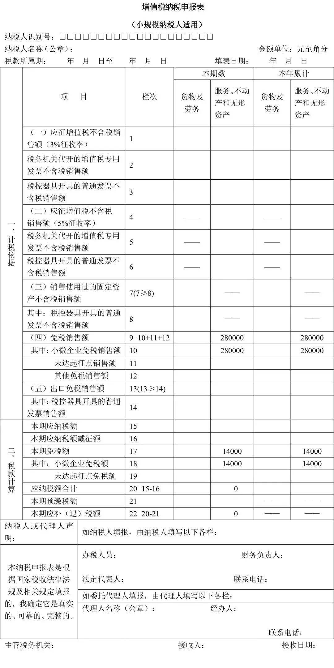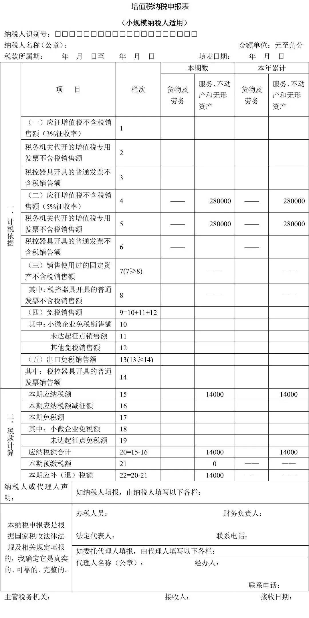 2、主表“服务、不动产和无形资产”列第15栏、第20栏填写1.4万(=28万×5%)