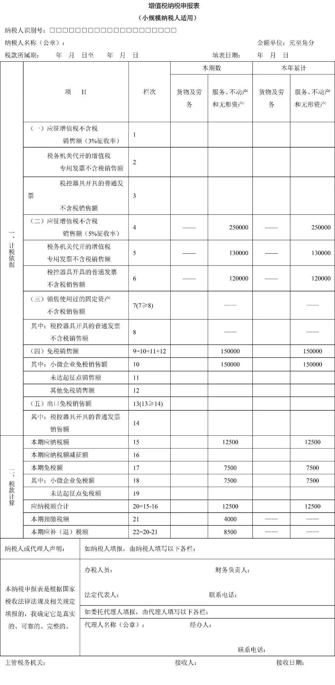 5、将本期应纳税额1.25(=25×5%)万元填列于第15栏、第20栏,由于代开增值税专用发票时已预缴税款0.4(8×5%)万元,因此本期应补(退)税额为0.85(=1.25-0.4)万元。