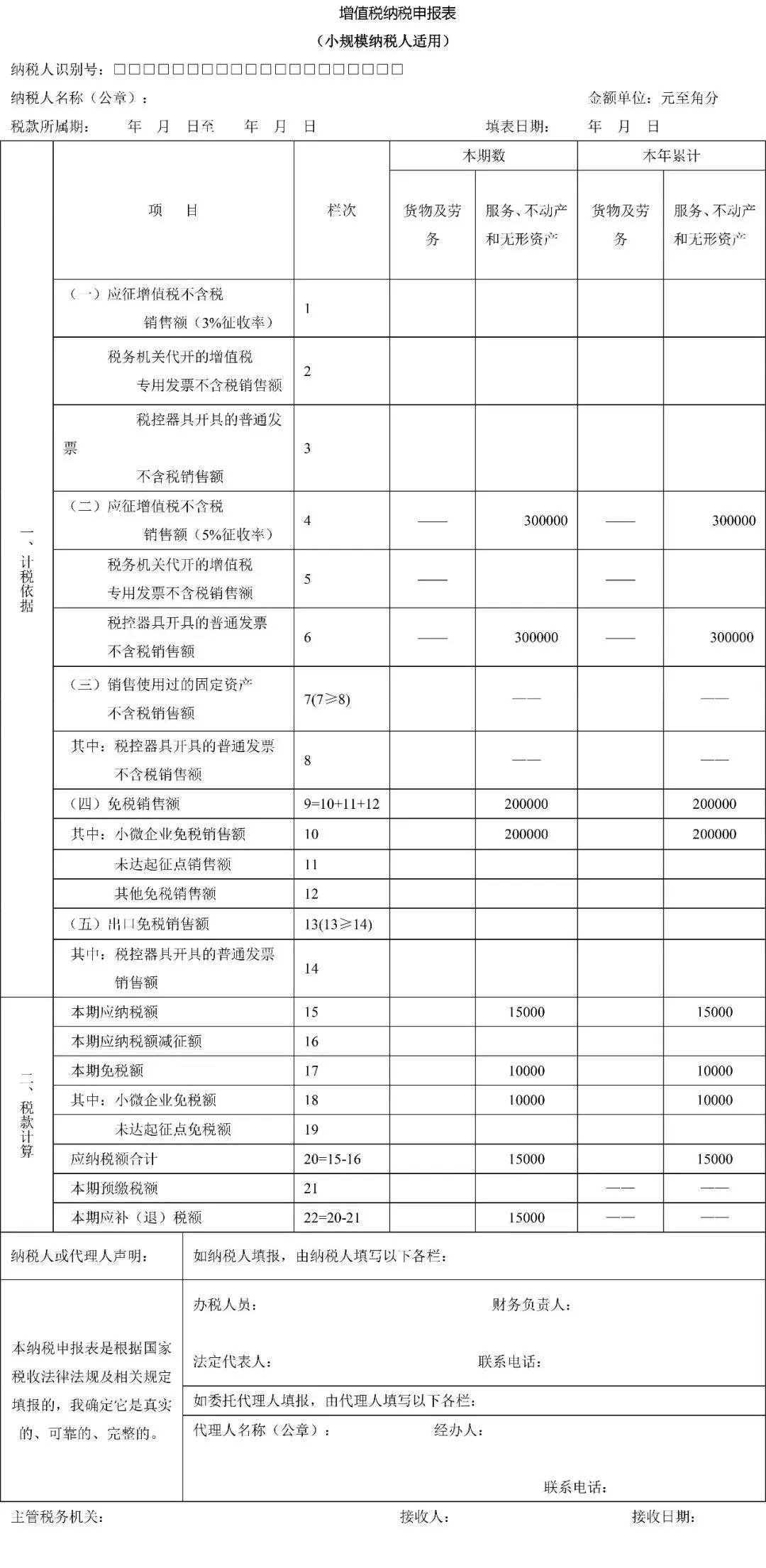 4、出租不动产开具增值税普通发票销售额15万元可以免税,应将其填列于第9栏、第10栏,将相应的免税额0.75(=15×5%)万元填写于第17栏、第18栏;