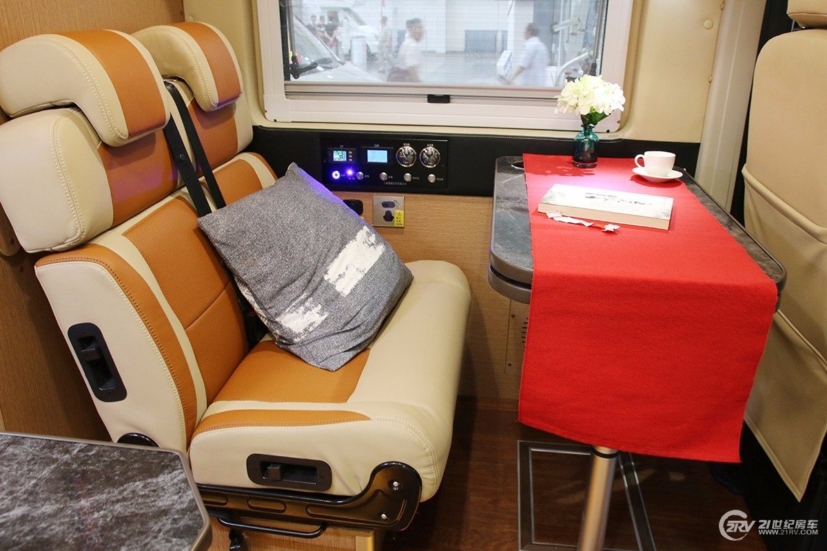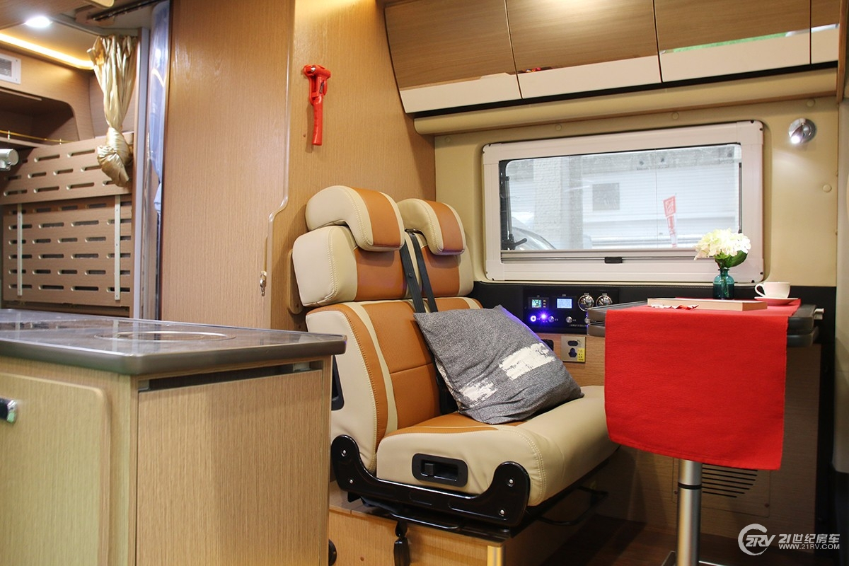 另外,细节方面,卫生间受限于B型车的空间问题,卫生间内部空间略小,不过作为基本的生活起居还是可以满足的。值得称赞的是厨房台面非常大,大理石纹路台面集成了不锈钢水龙头,水槽和一台圆形电磁炉,柜内是冰箱和储物空间,空间利用率比较高。配置方面,新车配备120Ah胶体电池2块,一台20寸前吸顶电视后18寸电视,12V电源插口,JBL音响系统,卫星天线,纽福克斯2000W充电逆变一体机,排风扇,驻车空调,行车空调等。