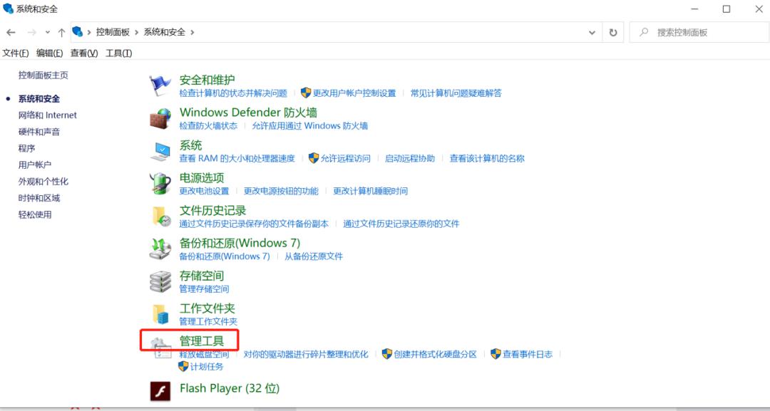 首先打开电脑的菜单键(开始键),然后打开控制面板,选择“系统与安全”,点击“管理工具”。