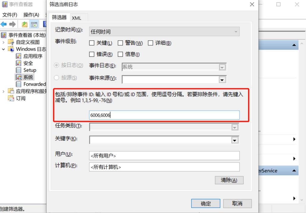 最后在筛选器界面的ID框中输入6005(开机时间),6006(关机时间),用英文逗号隔开,点击确定就可获知开机记录了。