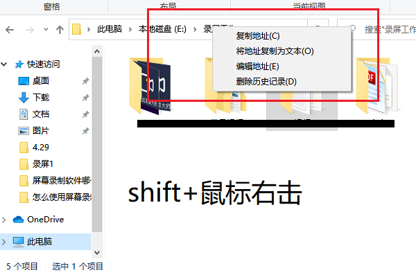 有时候我们需要将一个文件的完整路径复制下来,或者需要从当前目录进入命令行。可以直接点击文件地址栏,然后按住Shfit键同时鼠标右击,就会出现增强版的右键菜单了,直接复制途径即可。