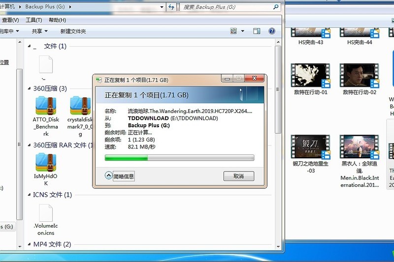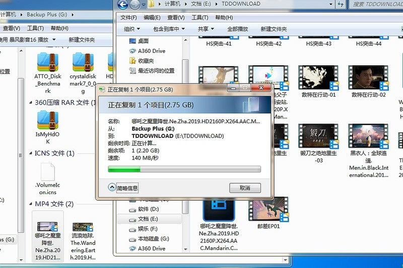 上面的测试,其实针对的只是移动硬盘的写入速度,而我当时忽略了从移动硬盘拷贝文件的测试。前两天刚好在拷贝一部电影时,才留意到了从移动硬盘复制视频文件到电脑的传输速度达到了140 MB/s,比当时软件测试的数据还高,可见这款移动硬盘在实际使用中的文件传输速度是非常出色的。