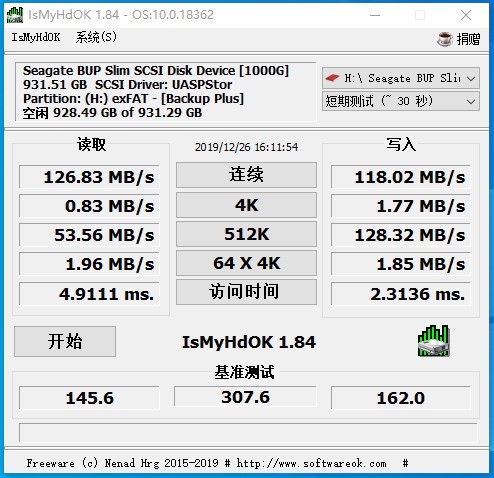 对于移动硬盘的读写速度,我通过了ATTO磁盘基准测试和IsMyHdOK硬盘测试软件进行了测试。从测试结果可以看到,硬盘的最大读写速度都超过了100MB/s,没想到我这个老电脑也能有这样的读写速度,看来这款移动硬盘我没选错,让我一下感觉到我这老电脑又焕发了青春。