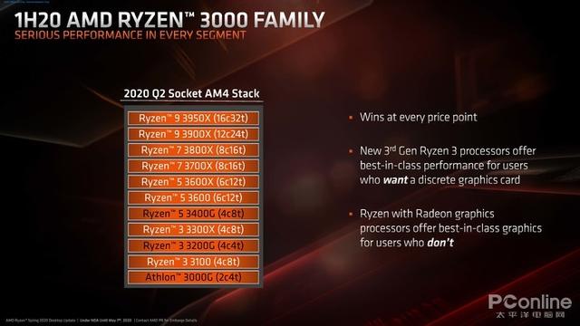 在AMD推出锐龙3 3300X与3100后,AMD也更新了它们的Ryzen 3000家族图(不是三代锐龙),目前还剩下三款12nm的Ryzen 3000处理器,均为APU,猜测在今年年底前AMD应该会完成对APU的升级,正式踏入7nm。