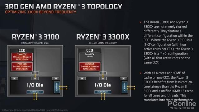AMD官方给出了两款处理器的内部设计示意图,I/O Die的设计两者一样,而CCD的设计上,锐龙3 3100为双CCX设计,但单CCX的核心数被屏蔽至两个,即2+2核心。锐龙3 3300X则为单CCX 4核心设计,屏蔽了另一个CCX。