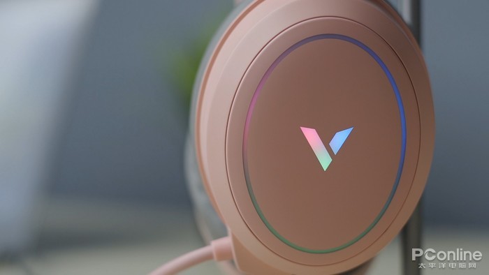 而雷柏VH610的主体部分与前者恰恰相反,采用的是圆形的设计,印有Logo以及一圈圆,可以发出RGB灯光。悬梁采用少见的分体式设计,官方称是飞翼式头戴,这一种设计可以满足不同的方向的稳固效果,可以达到舒适性更高的效果。