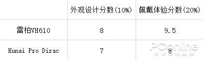 这两项的得分如下图所示,依靠飞翼式头戴设计,雷柏在佩戴体验上分数领先较高,这个设计确确实实可以提升不少的舒适性。在外观设计上TRITTON Kunai Pro Dirac的设计在外观上少去不少元素,VH610中有灯光效果,TRITTON Kunai Pro Dirac更多的是适合比较安静的用户。