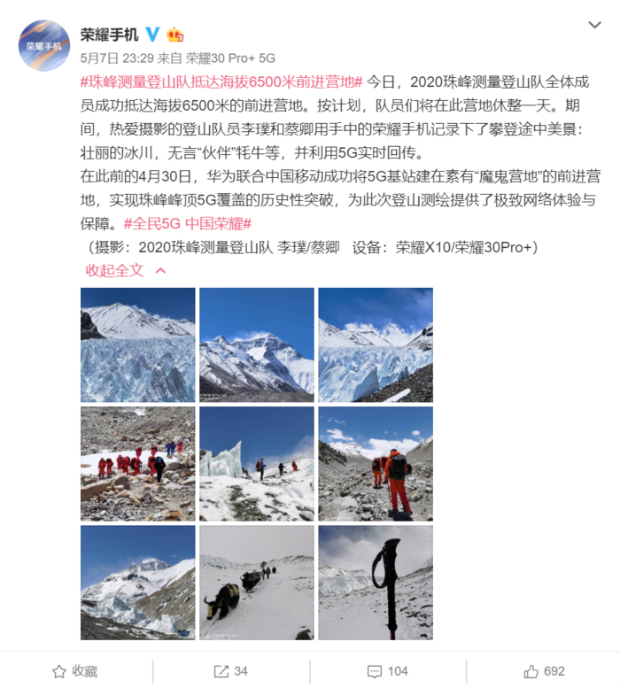 此前,荣耀老总赵明就曾表示,荣耀X10的更名并不是简单的数字调换,更有“10倍”的含义在其之中。除了性能的提升之外,荣耀X10的拍照也有很大的升级。荣耀官微在5月7日放出了一组由2020珠峰测量登山队利用荣耀X10拍摄的珠峰美景,并利用架设在珠峰的5G网络进行实时图片传输。