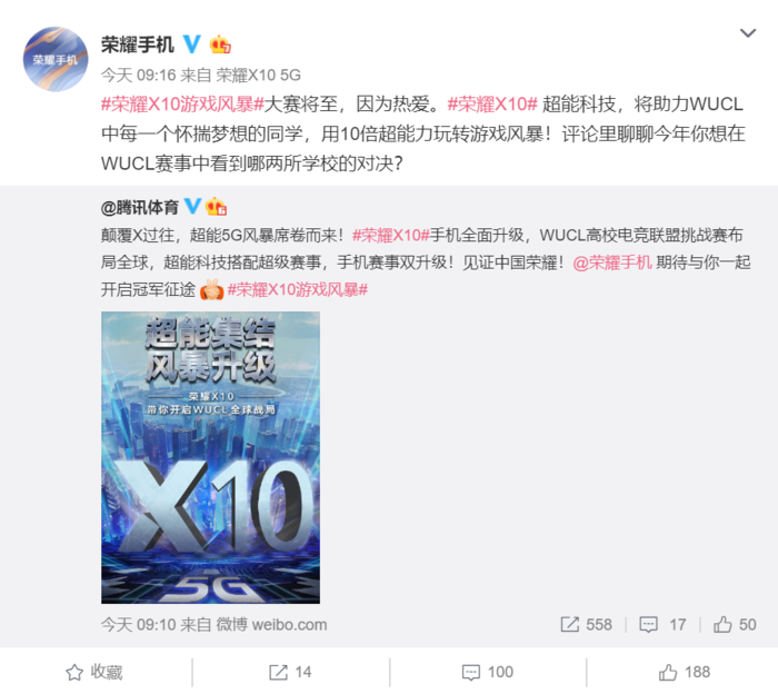 继5月6日荣耀手机官方微博正式官宣荣耀X10全面升级。今天,腾讯体育官方微博更是宣布荣耀X10将成为WUCL高校电竞联盟挑战赛的指定用机。
