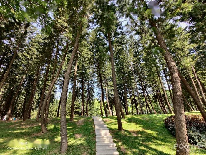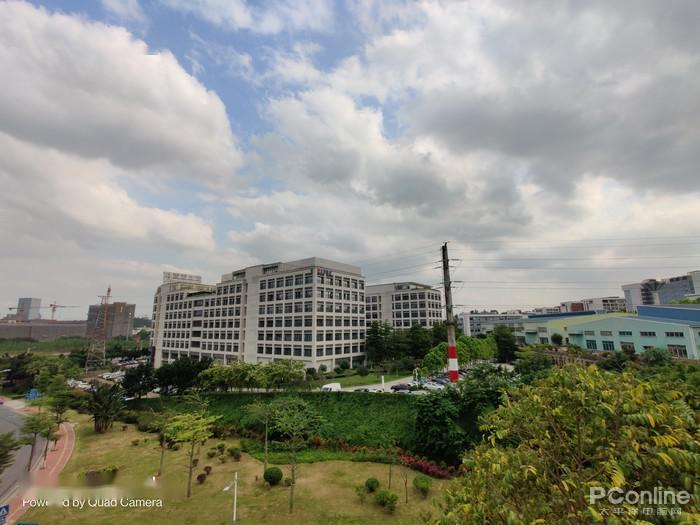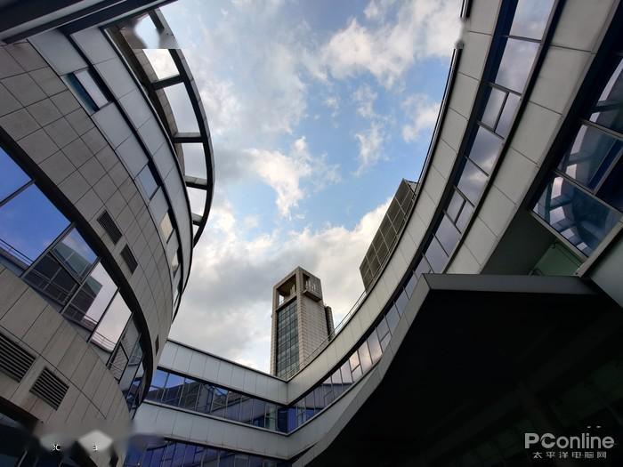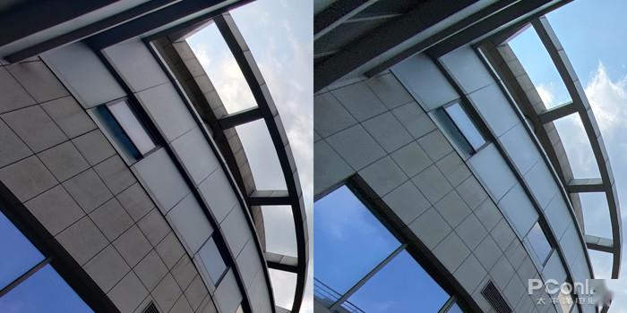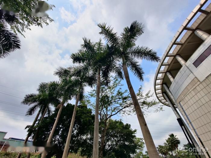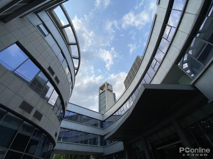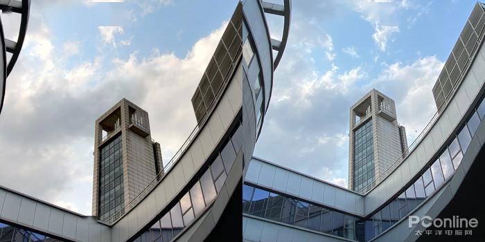 与一直稳定发挥的苹果 iPhone 11 Pro Max 的超广角摄像头对比(超广角等效13mm,120°),一加8 Pro 在开启超广角畸变矫正后,视角会有一定的损失,但换来了比苹果 iPhone 11 Pro Max 更好的边缘畸变控制;在画面的颜色保留上,这组对比样张的拍摄时间为 16 时,艳阳依旧高照但苹果的整体色调则更偏冷,没有将阳光照射下大楼的暖调进行适当的保留,而一加8 Pro 则将我们所看到的真实场景进行更好的还原保留,让照片更真、更接近现实。