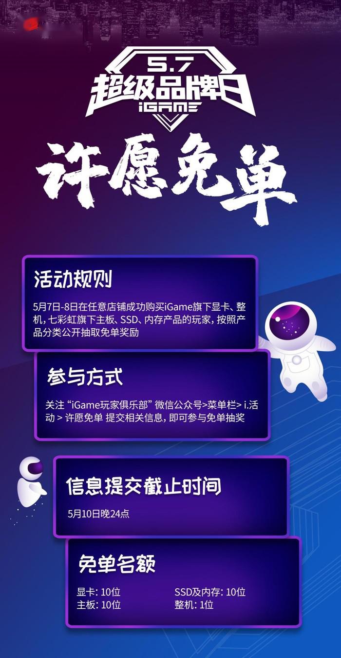 此外,活动期间在任意店铺购买iGame旗下显卡、整机、七彩虹旗下主板、SSD、内存产品的用户还可以参与免单许愿活动,中奖用户可以获得全额免单福利,如果能抽中免单一台顶配的iGame游戏整机就赚翻了。